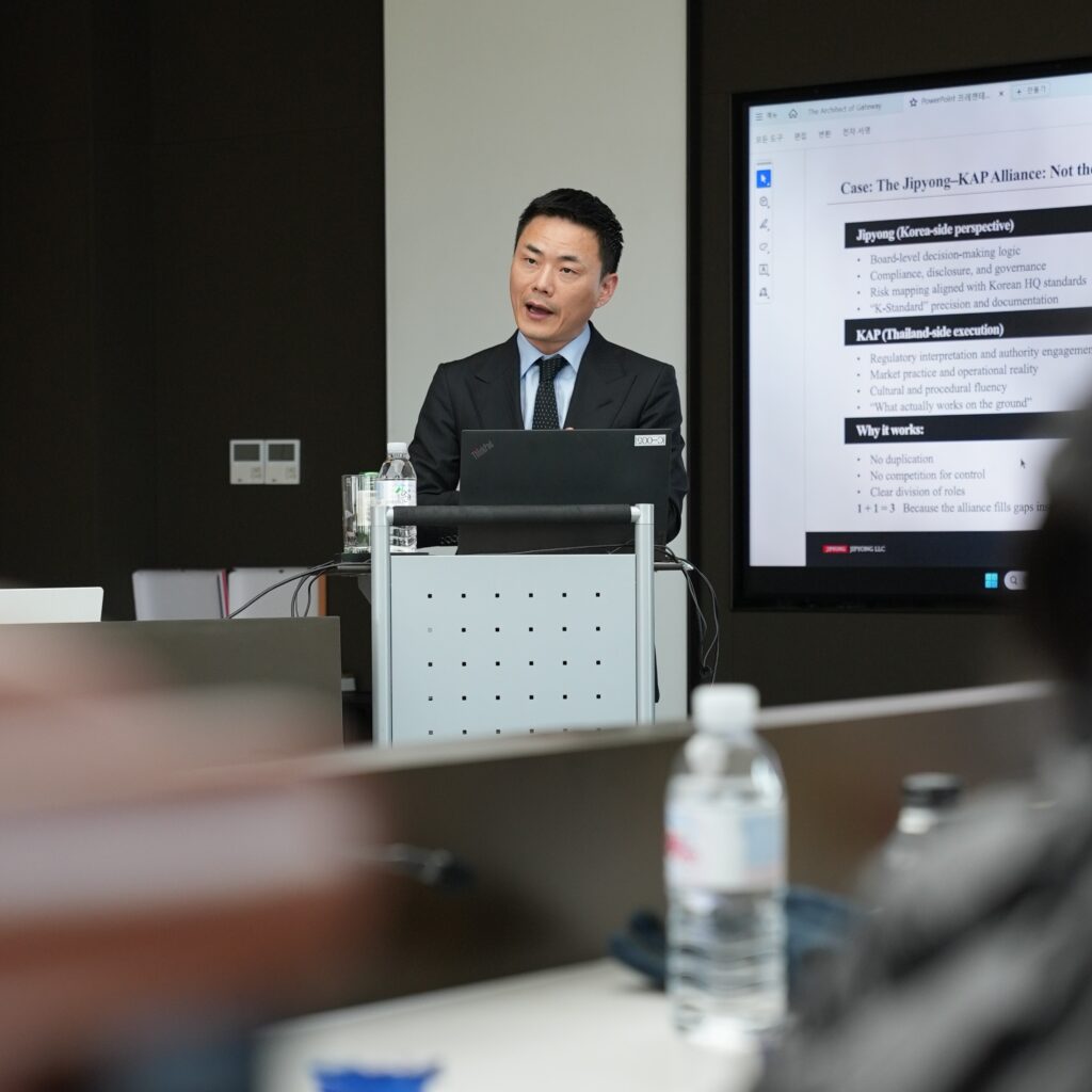 Jipyong LLC สำนักงานกฎหมายชั้นนำของสาธารณรัฐเกาหลี เปิดสำนักงานใหญ่ ชั้น 26 ณ อาคาร Grand Central กรุงโซล ต้อนรับคณะนักศึกษาและอาจารย์ โครงการ WorldNexGen 2026 อย่างอบอุ่น เพื่อเข้าเยี่ยมชมและรับฟังการบรรยายจากเครือข่ายพันธมิตร และบุคลากรของ Jipyong LLC โดยมุ่งเสริมสร้างความเข้าใจด้านกฎหมายระหว่างประเทศและธุรกิจในบริบทสากล นำโดย คุณพีรเดช พัฒนจันทร์ ประธานเจ้าหน้าที่บริหาร ธุรกิจพัฒนาพลังงานหมุนเวียน บริษัท บี.กริม เพาเวอร์ จำกัด (มหาชน) หรือ BGRIM พันธมิตรของ Seoul National University จากประเทศไทย ร่วมให้เกียรติบรรยายในหัวข้อ “Doing Business with Compassion” ถ่ายทอดความเป็นมาของการก่อตั้งบริษัท บี.กริม เพาเวอร์ จำกัด (มหาชน) พร้อมแนวคิดการดำเนินธุรกิจอย่างยั่งยืน ควบคู่ความรับผิดชอบต่อสังคมและจริยธรรมในการทำงาน